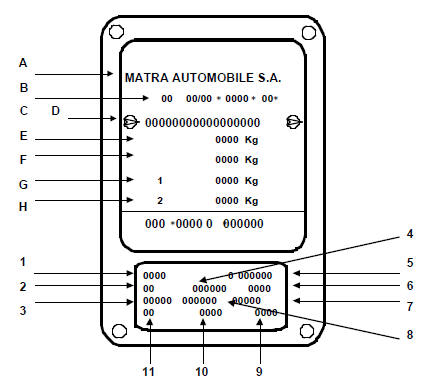 Nota : en fonction du pays d'exportation, certaines indications peuvent ne pas être portées, la plaque décrite ci-dessus étant la plus complète.
